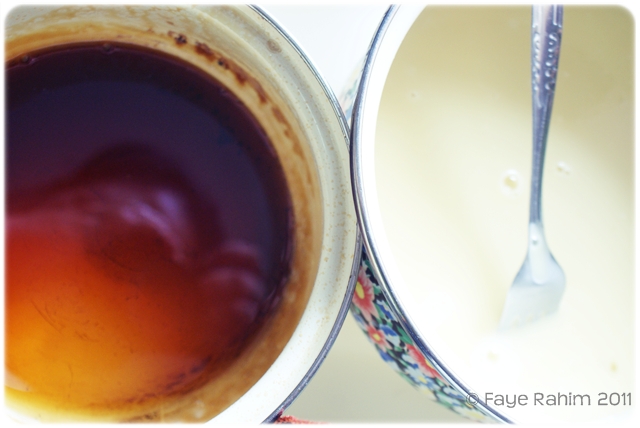 2. Masukkan gula pasir ke dalam periuk lain dan tenggekkan atas dapur. Masak hingga gula mencair, kacau selau. Bila guna menjadi perang, perlahan2 masukkan air panas dan terus mengacau. Matikan api.